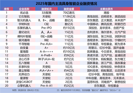 另据《BUG》栏目统计,截至今年11月30日,国内已披露获得融资且有相关机器产品的企业,仅前20家的累计融资额已达到206亿元。其中包括:优必选年内3次配售累计获得70亿港元(约63.574亿元)融资;它石智航年内两次天使轮累计获得约17.08亿元融资;以及乐聚机器人、星纪动元、银河通用等企业年内多次融资获得的超10亿元融资等。